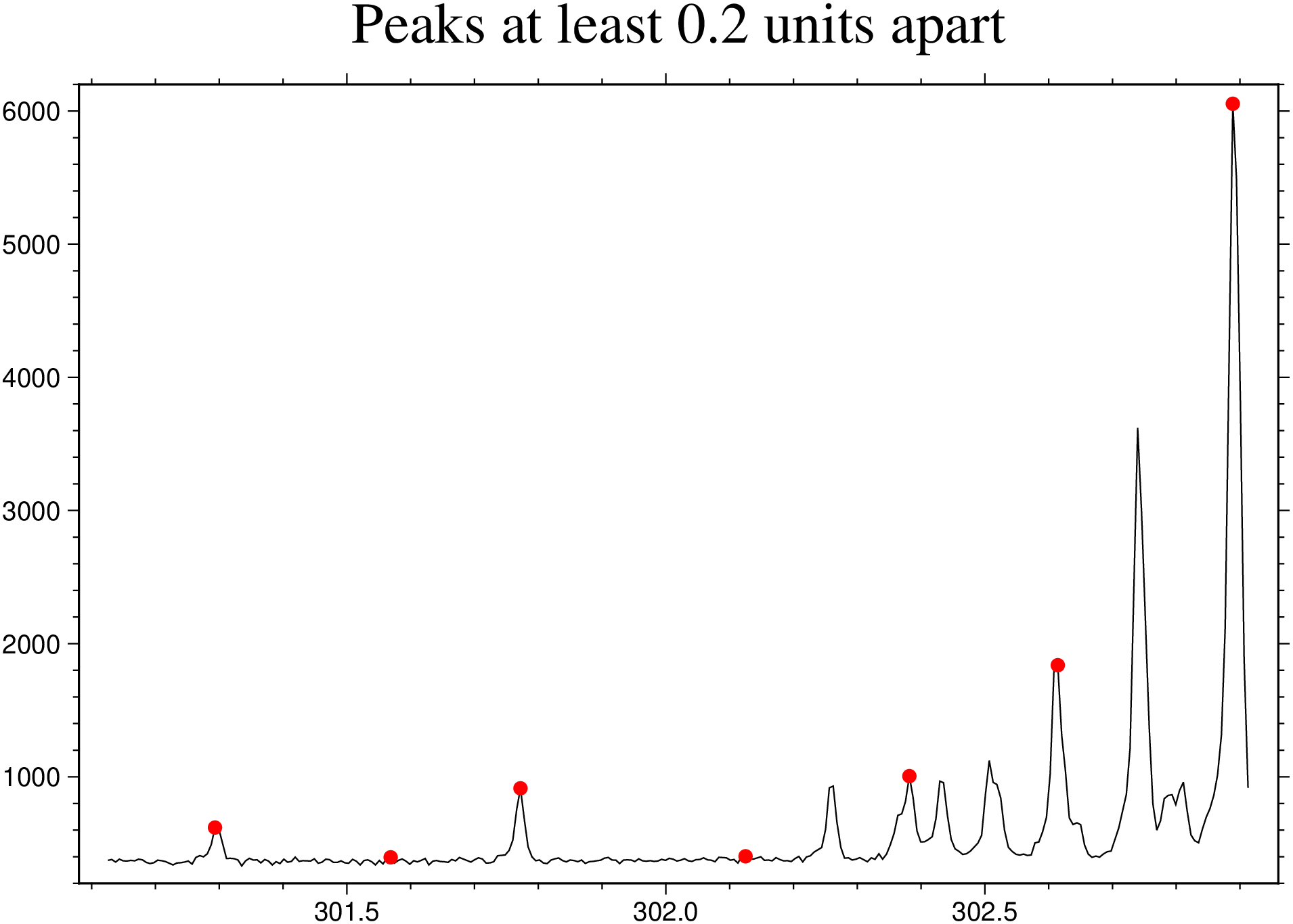 • min_dist: Minimum peak separation (keeping highest peaks). When you specify a value for this option, the algorithm chooses the tallest peak and ignores all peaks within min_dist of it.