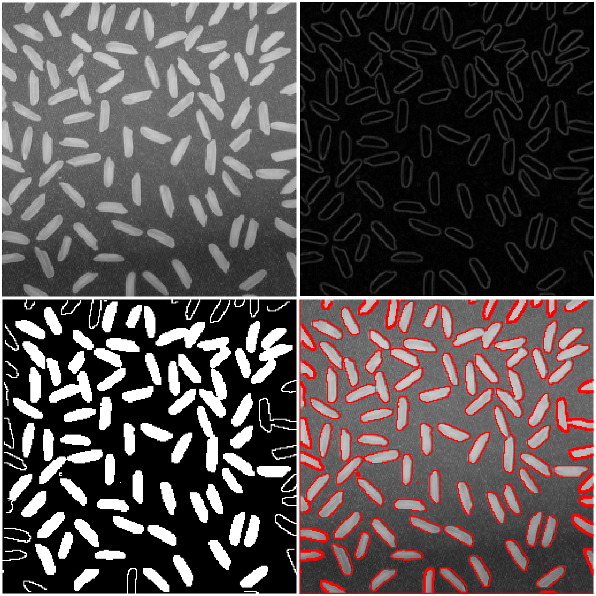 Let us vectorize the rice grains in the image "rice.png". The result is not perfect because the grains in the image's edge are not closed and therefore not filled. And those get poligonized twice (in and outside) making the red lines look thicker (but they are not, they are just doubled).