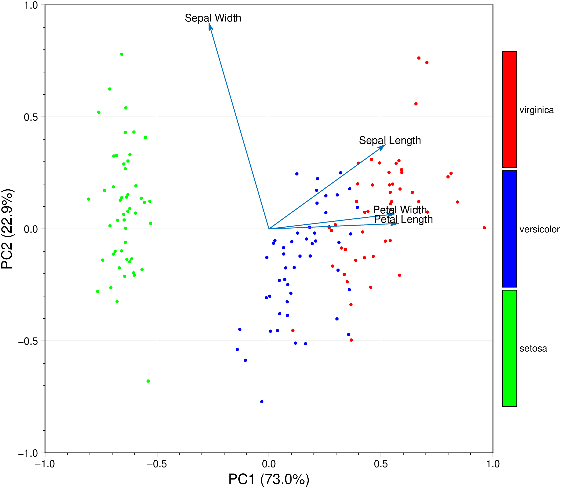 biplot(TESTSDIR * "iris.dat", figsize=6, obsnumbers=true, show=true)