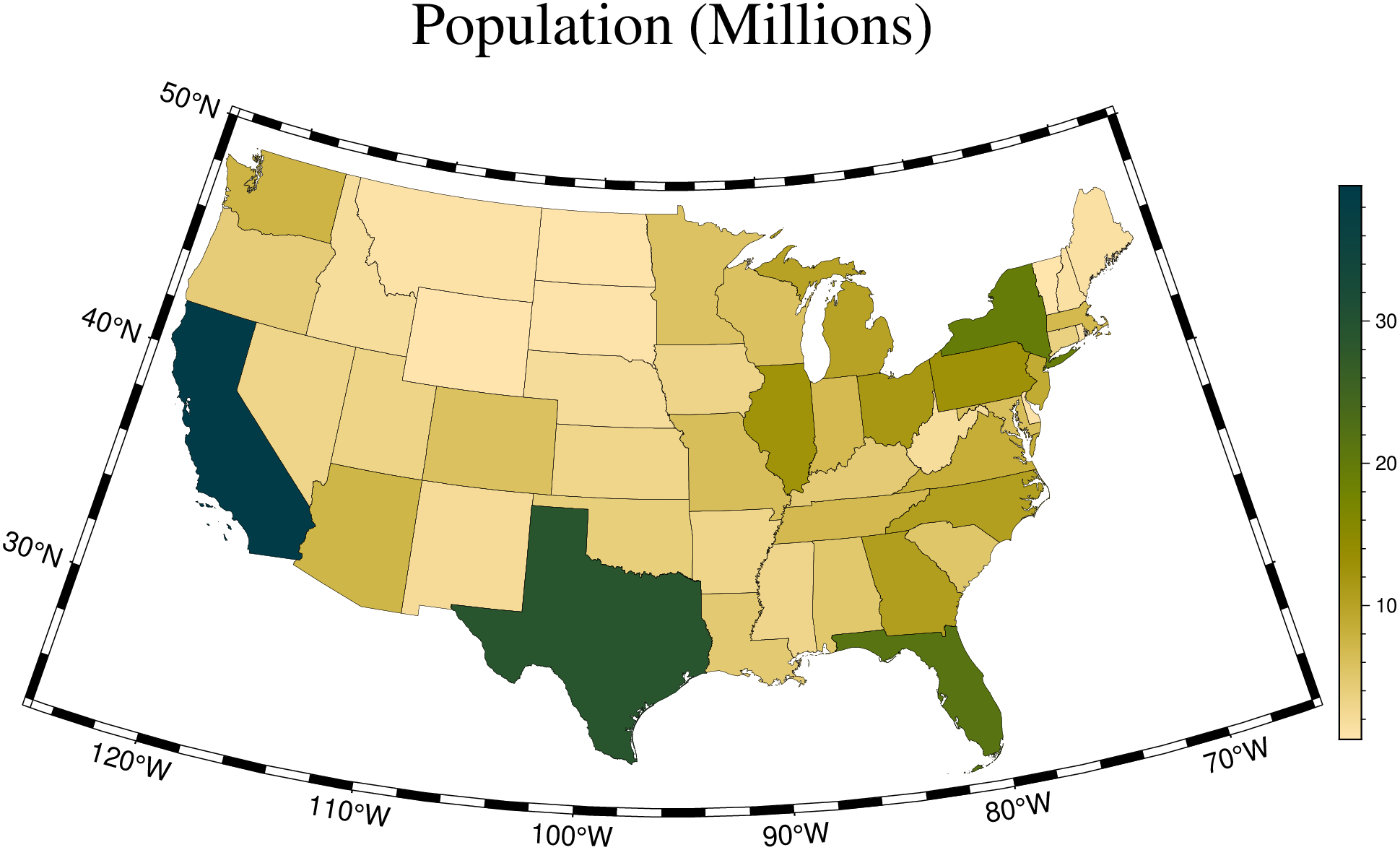 In all the examples above we have used the US states polygons from a downloaded file, but we actually no not need that as the internal GMT coasts database has the US states polygons. So, we can use the coast function to get extract the states polygons and use them in the same way as above. Here is an example that would produce the exactly same image. But note how attribute names are different now as state names are stored under the "CODE" attribute.