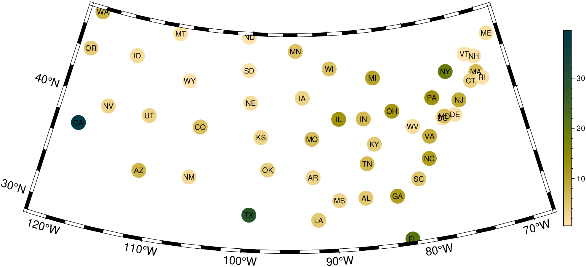 bubblechart(Df, labels="attrib=STUSPS", proj=:guess, zcolor=zvals,